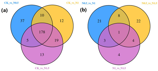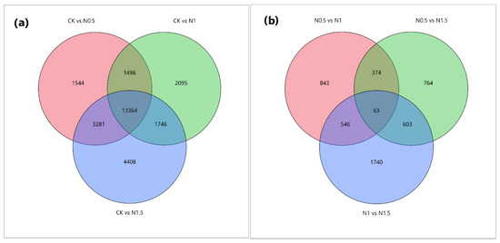 Venn diagrams illustrating the differentially expressed genes. The sum of the numbers in each circle represents the total number of expressed genes within a comparison. In contrast, the numbers in the overlapping areas represent the number of expressed genes shared (a) between the CK and treatment comparison groups and (b) between different treatment comparison groups of cotton seedlings. CK: no treatment; N0.5: NaCl treatment for 0.5 h, N1: NaCl treatment for 1 h, and N1.5: NaCl treatment for 1.5 h.
