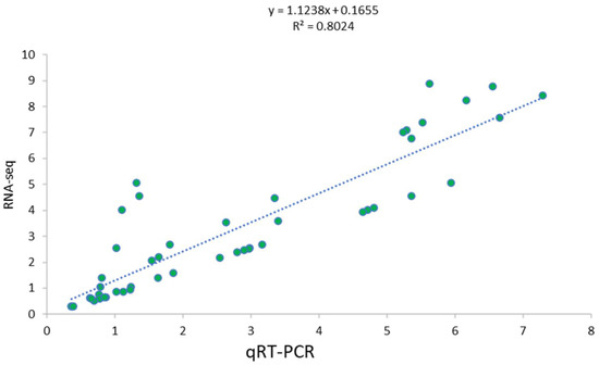 Correlation between gene expression patterns based on qRT-PCR and RNA-seq from randomly selected differentially expressed genes related to salt stress tolerance. The equation shows the regression line. The intercept of 0.1655 is the value of y when x = 0. The slope of 1.1238 measures the change in y for a one-unit increase in x. R2 is the coefficient of correlation between qRT-PCR and RNA-seq expression values.