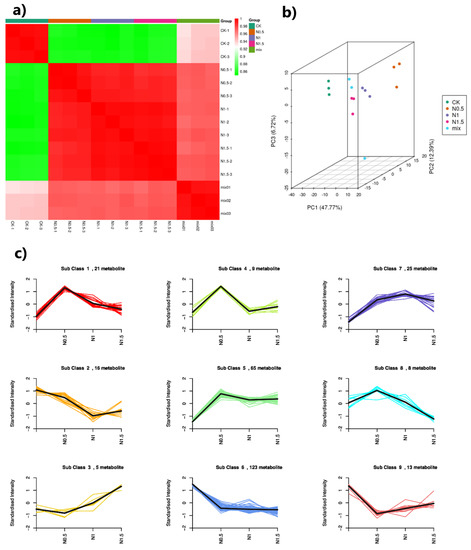 Quality control of metabolites identified in the experimental seedling sample extracts. (a) Pearson’s correlation coefficients and (b) principal component analysis (PCA) of metabolites extracted from cotton seedlings in the CK and treated groups after 0.5, 1, and 1.5 h treatments with NaCl; each sample was analyzed in triplicate and a quality control mix for metabolomics. (c) The k-means clustering of the differentially accumulated metabolites between the CK group and three treated seedling sample groups (CK: no treatment; N0.5: NaCl treatment for 0.5 h, N1: NaCl treatment for 1 h, and N1.5: NaCl treatment for 1.5 h; -1,2,3 represent replications). The X-axis represents the sample groups, and the Y-axis demonstrates the relative content of the standardized metabolites. Sub-class represents the number of the metabolite categories with the same changing trend, and the metabolite illustrates the number of metabolites in the category (metabolites within each sub-class are given in Table S9).