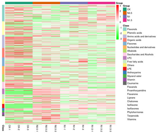 Heat map analysis of DAMs exhibiting fold changes of highly significant (p < 0.05) DAMs grouped into more than 16 classes related to different treatment groups and CK. The four columns represent the treatment groups and CK samples (green: control, brown: N0.5 h, indigo: N1 h, magenta: N1.5 h; −1, −2, −3 represent replications), with three further sub-divisions, one for each biological replicate in every sampled group. The correlation coefficients were utilized to classify different features determined by the Pearson correlation based on the averages/means as a clustering algorithm. The color gradient from red (3) to green (−3) depicts the number of compounds, presented as a relative fold change.