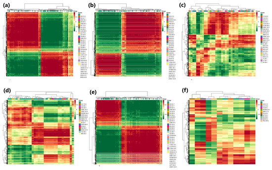 Heat maps of correlation coefficient matrices between DAMs and DEGs with the Pearson correlation coefficient above 0.8, which resulted from the combined analysis of transcriptome and metabolome metabolites in comparison groups of seedling samples of cotton seeds pre-treated with NaCl for 0.5, 1, and 1.5 h, as well as the CK group. The color gradient from red to green demonstrates a positive to a negative correlation between seedling comparison groups: (a) CK-vs.-N0.5, (b) CK-vs.-N1, (c) CK-vs.-1.5, (d) N0.1-vs.-N1, (e) N0.5-vs.-N1.5, and (f) N1-vs.-N1.5.