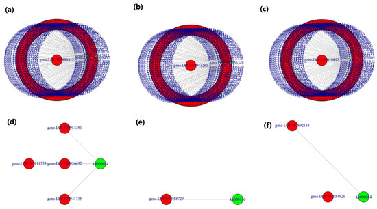 Correlation network diagram of DEGs and DAMs involved in the production and regulation of glucose-1-phosphate (G1P), uridine 5′-diphospho-D-glucose (UDP-G1c), and 2-deoxyribose 1-phosphate (dR-1-P) of cotton seedlings in the CK group and seedling samples that were NaCl-pre-treated for 0.5, 1, and 1.5 h, illustrating the KEGG pathway enrichment of DEGs and DAMs viz. (a) CK-vs.-N0.5, (b) CK-vs.-N1, (c) CK-vs.-1.5, (d) N0.1-vs.-N1, (e) N0.5-vs.-N1.5, and (f) N1-vs.-N1.5. Green circles represent DAMs. In contrast, s represents DEGs, while the connecting lines represent their correlations, with solid ones for positive correlations and dotted ones for negative correlations.