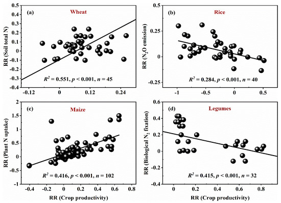Relationships between the response ratios of wheat, rice, maize, and legume productivity vs. the response ratios of (a) soil total N, (b) N2O emission, (c) plant N uptake, and (d) biological N2 fixation.