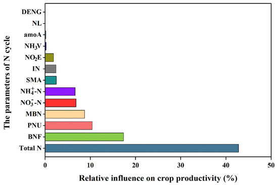 The ABT analysis was carried out to compare the relative importance (major influence factors) of N cycle parameters with biochar addition on overall crop productivity (Figure 3). In total, 92.8% of the variances in the crop productivity are explained by the first six factors of TN, MBN, NH4+-N, NO3−-N, BNF, and PNU. Notably, the factors of soil N pool (i.e., TN, NH4+-N, and NO3−-N) and N fixation (i.e., PNU) were the most influential variables on crop productivity under biochar addition among the 13 chosen variables (Figure 3).
