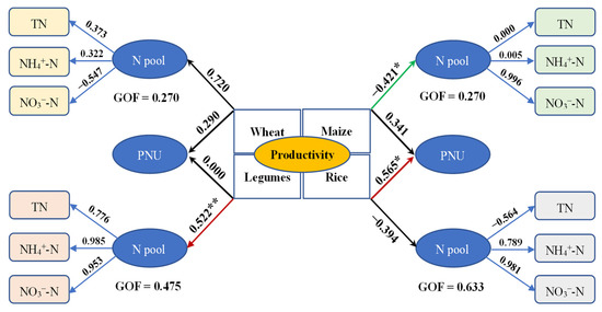 Partial least squares (PLS) path analysis results on the direct and indirect effects of soil N pool (soil total N: TN; ammonium N: NH4+-N; and nitrate N: NO3−-N) and plant N uptake (PNU) on wheat, maize, rice, and legume productivity. Numbers show the path coefficients. Green and solid red paths indicate negative and positive effects (* and ** represent p < 0.05 and 0.01); The PLS path analysis was assessed using the Goodness of Fit statistic (GOF), and the GOF value was 0.270-0.633. the corresponding latent variables with their considered indicators are under the path analysis results. Numbers below the index show the loading scores (the correlation coefficient between the latent variable and its indicators).