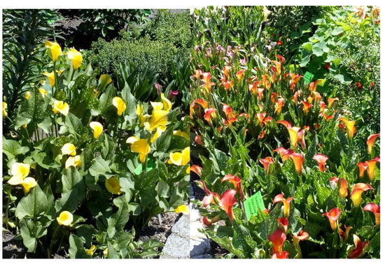 Zantedeschia elliottiana, Z. rehmanii and Z. albomaculata go through a rest period from October to February. Rhizomes are stored in openwork containers and covered with sawdust in a storage room at 12–15 °C, and for long-term storage, they are stored at only 8 °C [28]. In Poland, Zantedeschia flowers with colourful inflorescence spathes are grown primarily under cover—in greenhouses and plastic tunnels (Figure 2). Ground cultivation (Figure 3) is also possible. Its advantage is the better quality of the flowers, which, while shorter, have stiffer stems and better coloured inflorescence spathes. Moreover, rhizomes grow better in the ground [7]. The reasons for this phenomenon can be traced to the intensity of light, which is reduced under cover in order to reduce the temperature, which is often excessively high during the summer for the cultivation of Zantedeschia, in which, although it does not show a photoperiodic response, both the colouration of inflorescence spathes and the rigidity of the stems depend on good sunlight [29].