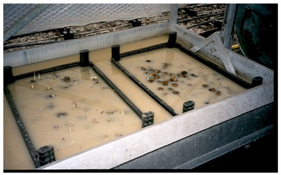 The substrate should be humus and permeable, with a pH of 5.8–6.2, enriched with slow-release fertilizers such as Osmocote Plus 3–4 M, in the amount of 3 g∙dm−3. Substrates of various compositions are used around the world. In New Zealand, it is a mixture of composted pine bark (70%) and 3 mm diameter pumice (30%). In the Netherlands, coconut husks, high peat or pearlite are added instead of pumice. Zantedeschia flowers are also grown in mineral wool, which, on the one hand shortens the cultivation cycle and, on the other hand, enables rapid isolation of diseased plants. Rhizomes are planted in cubes, which are then placed in a special camera for 2–3 weeks for “initial sprouting” (Figure 4) [28]. There is also the possibility of growing in pearlite itself, which does not heat up in hot weather thanks to its white colour [30].