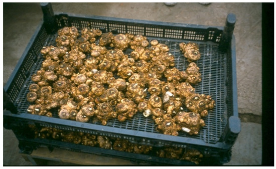 Small rhizomes with a circumference of 8–9 cm are planted in the amount of 40 per m2, while those with a circumference of 16–18 cm are planted in the amount of 20 per m2. Rhizomes with a circumference of more than 20 cm are planted in the amount of 15 per m2 [7]. They are covered with a 6–10 cm thick substrate to shield the roots growing out of the upper part of the rhizome. Before planting, the rhizomes are treated with 1% Captan for 20 min [7,28].
