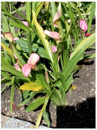 - Janowska, B.; Stanecka, A.; Czarnecka, B. Postharvest longevity of the leaves of the Calla lily (Zantedeschia Spreng.). Acta Sci. Pol. Hortorum Cultus 2012, 11, 121–131. [Google Scholar]