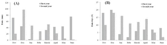 Total precipitation (A) and rainy days (B) per month during the two-year trial of the durum wheat cycle.