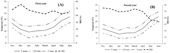 Mean air temperature, absolute minimum and maximum temperatures, and relative humidity (RH) for month during the first (A) and second (B) year of the durum wheat cycle.