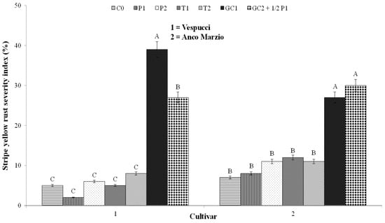The climatic trend of 2021, which was characterized by frequent rainfall, temperature between 14 and 22 °C, and high air RH during the phenological phases of stem elongation, booting, early emergence, and kernel ripening favored infections of Pst that reduced the productivity of both cultivars in the second crop cycle by showing a different epidemiological trend associated with the fertilization management. Evaluation of rust attack severity has been highlighted (Figure 3): (i) no significant difference between the cultivars; (ii) a significant increase of severity on both cultivars with the compost-based fertilization; (iii) a higher disease severity on Vespucci if compost was applied alone (GC1); (iv) absence of difference on Anco Marzio when the reduced dose of compost was associated with the half dose of mineral fertilizer (GC2 + 1/2 P1); and (v) the unfertilized control (C0) showed lower severity than the compost-fertilized theses. Therefore, it is noticeable that compost supplementation has increased the severity of stripe yellow rust with greater effect on Vespucci than Anco Marzio if compost was applied alone. When compost was applied in combination with mineral superphosphate, such treatment determined a significant increase of severity with respect to mineral fertilization without difference between the cultivars. This finding highlights that the greater severity occurred with the compost-based fertilization than the mineral ones.