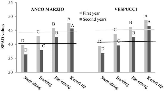 Mean SPAD values observed at the following crop stages: stem elongation, booting, ear emergence, and kernel ripening phases in two durum wheat cultivars (Anco Marzio and Vespucci) grown under different fertilization regime during the first and second year. For each effect considered, the values followed by the same letter are not significantly different, according to the SNK test at p = 0.01.