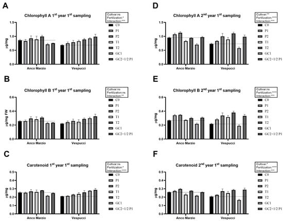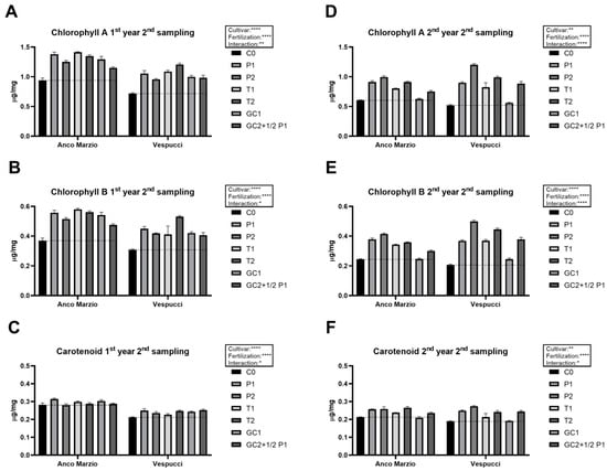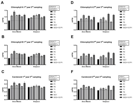 Pigment (Chlorophyll A, B, and Carotenoid) content on samples collected during the second crop stage (stem elongation). Data are related to the first (A–C) and second (D–F) year of analyses. Data were reported by indicating the statistical significance of two factors (Cultivar and Fertilization) and their interaction. Data are reported with p-values. * p ≤ 0.05; ** p ≤ 0.01; **** p ≤ 0.0001.
