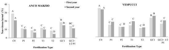 Production responses were significantly different by year, cultivar, and fertilization (Figure 8). The 2019/2020 period was the more favorable with an average grain yield of 4.68 Mg ha−1, while in 2020/2021, due to rust attacks and higher temperature in the grain period, there was a lower yield averaging 3.86 Mg ha−1. In both years, the most productive cultivar was Vespucci. In the first year, for both cultivars the highest grain production was recorded when plants were treated with mineral fertilization or with organic fertilization supplemented with half of mineral fertilization (GC1 + 1/2 P1). Always in the first year, lower productions occurred for crops subjected only to organic fertilization, with an increase over the unfertilized control of 25.52% for the cultivar Anco Marzio and 30.92% for Vespucci. In the second year, both cultivars responded differently to fertilization (significant interaction for year × cultivar × fertilization). The contribution of a higher dose of phosphorus (140 kg ha−1), regardless of the type, favored a significant increase of 10.39% in grain production in the cultivar Anco Marzio compared with the dose of 100 kg ha−1. No significant differences were found between the grain production obtained with the fertilization of 100 kg ha−1 of P and the organic fertilization integrated with half of mineral fertilization (P1). Lower yields of 31.12% for Anco Marzio and 26% for Vespucci were obtained when the crop was fertilized with organic fertilizers compared with mineral ones. However, with organic fertilization yields increased on average by 67.43% compared with the unfertilized crop.
