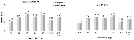 Closely related to the vitreousness of the caryopses was their protein content. The highest percentage of protein content (on average 13.78%) was reached when the crop was treated with mineral fertilizers, with the highest dose of phosphorus (140 kg ha−1 of P2O5). Varying the type of fertilization, the protein content, on average, decreased to 12.51%, 12.14%, 10.60%, 9.75%, respectively, when the crop was fertilized with mineral fertilization with the lowest dose of phosphorus (100 kg ha−1 of P2O5), integrated organic fertilization with half of mineral, organic fertilization, and unfertilized control (Table 4 and Figure 10). In each case, grain protein content was higher in Anco Marzio (Table 4). No differences were found between different types of phosphorus, nor between the years, despite rust attack and more unfavorable weather conditions occurred in the second year.