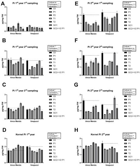 Phosphate content (Pi) on the leaf (at three crop stages) and kernel (at the stage of ripening) samples. Data are related to the first and second year of analyses. Data were reported by indicating the statistical significance of two factors (Cultivar and Fertilization) and their interaction. Data are reported with p-values. * p ≤ 0.05; ** p ≤ 0.01; *** p ≤ 0.001; **** p ≤ 0.0001; ns: non-significant.