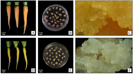 The two inbred lines used for transcriptome and resequencing analyses in this study were orange taproot wild-type (wt) and yellow taproot mutant (ym) carrots. wt is an inbred line with orange and conic root (Figure 1A) developed from a landrace. ym is a mutagenic inbred line with yellow and conic root (Figure 1D) developed from EMS-induced wt mutagenesis. The roots of wt and ym were surface-sterilized and cross-cut into 1–2 mm thick discs, which were then cultured on MS medium supplemented with 0.5 mg/L 6-benzylamino-purine and 30 g/L sucrose (pH 5.8), and then solidified with 2 g/L Phytagel at 26 °C in the dark. Consecutive subculture was conducted once every 3–4 weeks under the same conditions. After 3 months, the orange (Figure 1B,C) callus and the pale-yellow callus (Figure 1E,F) produced stable lines.