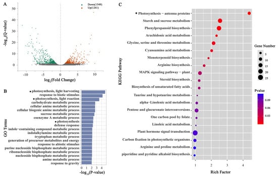 Screening and enrichment analysis of DEGs between wt and ym. (A) Volcano plot of DEGs. grey dots: genes with no significant difference; red dots: significantly up-regulated genes; green dots: significantly down-regulated genes. (B) Top 20 terms of GO enrichment analysis of DEGs. The GO analysis classifified the genes with corrected p-values of less than 0.05 into DEGs. (C) Top 20 pathways of KEGG analysis of DEGs.The KEGG analysis classifified the genes with corrected p-values of less than 0.05 into DEGs. The five-pointed star represents photosynthesis-related items or pathways.