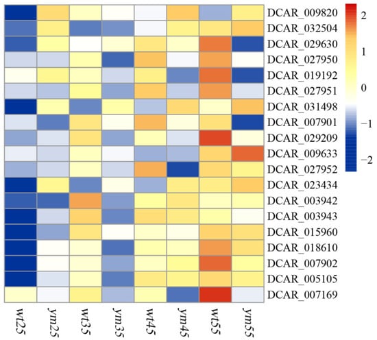 Heatmap of the 19 photosynthesis-related genes between wt and ym during the accumulation of carotenoids.
