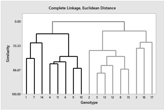 Clustering of 17 rice genotypes with response to water-deficit treatment (DS).