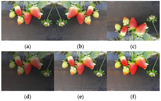 Images of strawberry samples collected under greenhouse environment. (a) Mature strawberry; (b) near-mature strawberry; (c) immature strawberry; (d) uncovered strawberry; (e) strawberry under strong light; (f) covered strawberry.