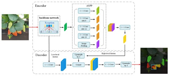 The DeepLabV3+ network model was applied to strawberry image segmentation, and its model structure and segmentation effect are shown in Figure 5. Although the model can segment the strawberry image regions well, there are mis-segmentation cases when classifying strawberry images with different maturities, and the overall segmentation accuracy is low. Since the backbone network Xception and ASPP modules in DeepLabV3+ model adopt depthwise separable convolution and Dilated Convolutions with different expansion rates (6, 12, 18), respectively, although it improves the overall operational efficiency of the model, it reduces the extraction ability of target features and affects the association between local features of the target, thus producing the phenomenon of target semantic segmentation void; when DeepLabV3+ model deepens the number of network layers in the forward propagation process, the representation of obscured strawberry fruit features becomes weaker and weaker, leading to the disappearance of strawberry detail features in the whole network propagation process and the phenomenon of missegmentation.