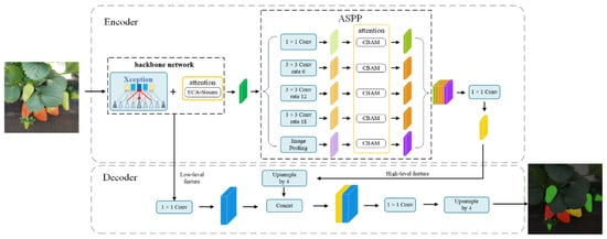 To address the above problems and considering the deployment of a strawberry image segmentation model in strawberry picking robots, the segmentation accuracy of the model needs to be improved without losing model operation efficiency. Therefore, this paper introduces the attention mechanism into the backbone network and ASPP module of the DeepLabV3+ model, respectively, and proposes an improved DeepLabV3+ strawberry image segmentation method. The structure of the improved DeepLabV3+ network is shown in Figure 6.