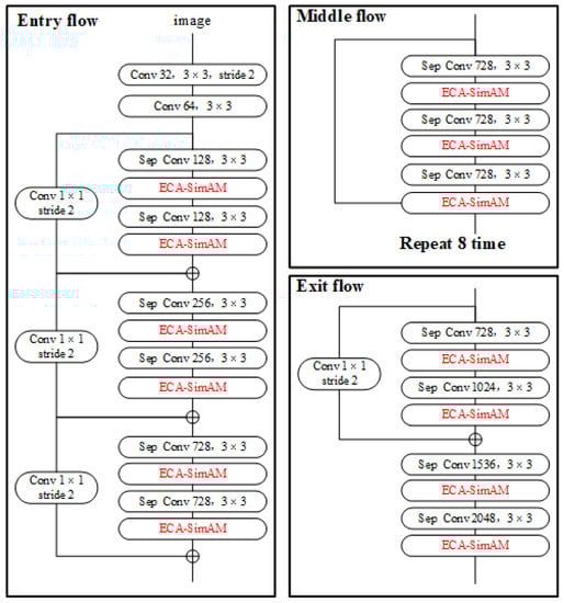 The dual-attention mechanism optimizes the backbone network as shown in Figure 8, where the black font indicates the original structure of the backbone Xception network and the red font indicates the access attention module. Xception consists of Entry flow, Middle flow and Exit flow, each of which makes extensive use of deep separable convolution to split the correlation between the spatial dimension and the channel dimension, reducing the number of parameters needed for convolution calculations, reducing the complexity of parameter calculations, making the model more lightweight and losing some detection accuracy. Therefore, after each depth-separable calculation of the Xception network, the ECA-SimAM module is introduced to strengthen the correlation of the network extracted feature information in the spatial and channel domains, thus enhancing the feature extraction capability of the Xception network and providing model image segmentation accuracy.