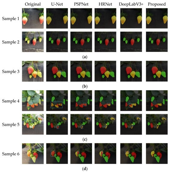 From Figure 10c, it can be seen that U-Net, PSPNet, HRNet, and DeepLabV3+ all showed missegmentation when the fruit was obscured by leaves. In sample 4, U-Net could not accurately segment the strawberry images, and PSPNet, HRNet and DeepLabV3+ had difficulty in accurately extracting the detailed features of strawberries of different maturity and failed to accurately segment the strawberry images of different maturity; in sample 5, U-Net and PSPNet incorrectly classified the ripeness of strawberries, and HRNet and DeepLabV3+ accurately classified the ripeness of strawberries, but failed to completely segment the strawberry images in the unobscured area, while the model in this paper can not only accurately classify the ripeness of strawberries but also completely segment the strawberry images.