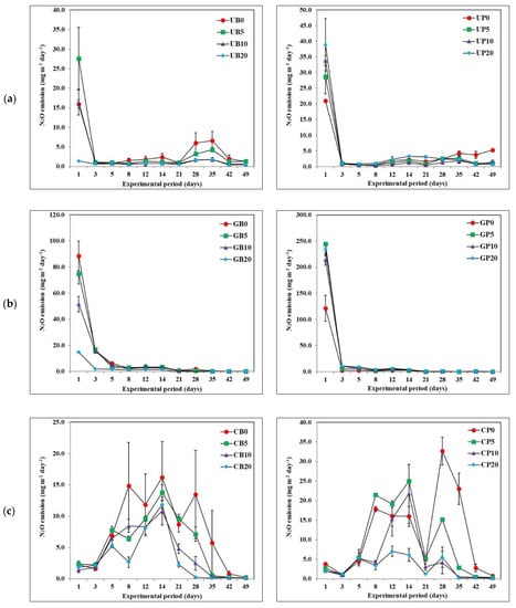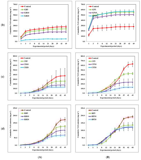 In the greenhouses, N2O emissions were significantly reduced in the GB5, GB10, and GB20 experimental groups, but significantly increased in the GP5, GP10, and GP20 experimental groups. Compared with the control group, cumulative N2O emission in GB5, GB10, and GB20 was reduced by 15.5%, 51.7%, and 465.1%, respectively, but increased by 50.0%, 45.0%, and 50.5% in GP5, GP10, and GP20, respectively (Figure 3).
