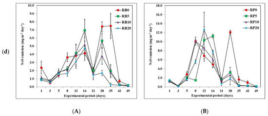 In the reclaimed land soil, no significant difference was found in the experimental and control groups. However, there was no difference from the control group before the 28th day, but after the 28th day, a difference in the biochar-treated group was observed. N2O emissions were reduced by 18.2%, 43.3%, and 94.5% in RB5, RB10, and RB20, respectively, on the 49th day. N2O emissions decreased in RP5, RP10, and RP20, and were reduced by 27.0%, 28.7%, and 30.6%, respectively (Figure 3).