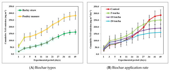 Cumulative N2O emission according to biochar types and application rates under incubation conditions during the 49 days. The error bars represent standard errors (n = 3). (A): Cumulative N2O emission by biochar types on all soil characteristics. (B): Cumulative N2O emission by biochar types on all soil characteristics.