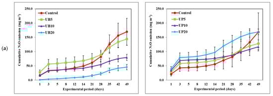 As a result of analyzing the cumulative N2O emissions after applying biochar in upland soil, N2O emissions significantly decreased in the UB10 and UB20 treatment groups. No significant differences were observed in the UB5, UP5, UP10, and UP20 experimental groups. N2O emissions were reduced by 53.0% and 313.2% in UB10 and UB20, respectively, with 48.1 ± 3.9-mg m−2 and 17.8 ± 3.0-mg m−2, compared with the control group with 73.7 ± 10.6-mg m−2 (Figure 3).