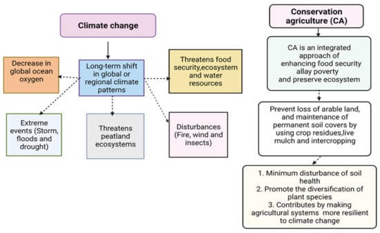 Schematic representation of how conservation agriculture interferes with climatic changes and crops.