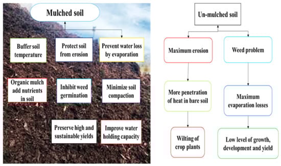 In general, the selection of a proper mulching material depends on the material type, the type of crop, environmental locations, and the availability of mulch, as well as their cost effectiveness []. Table 2 illustrates a comparison between organic and plastic mulching.