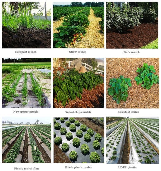 Organic, inorganic, and special materials are the three types of mulching materials. Agricultural wastes, wood industrial wastes, processed leftovers, and animal manures are used to make organic mulching materials (Figure 4). Polyethylene plastic films and synthetic polymers are examples of inorganic mulching materials []. Several innovative biodegradable and photodegradable plastic films, as well as surface coating and biodegradable polymer films for ease of implementation and flexibility, were also introduced as ecologically friendly materials [].