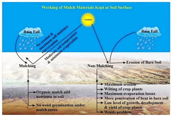 Mulch reduces the germination of seeds by preventing sunlight from reaching the top surface of the soil. After forming a protective surface on the soil, plastic films or landscape fabrics also stop weeds from germinating []. Underneath the plant leaves, sand and clay soil reflect heat and light. Due to their multidimensional faces, organic mulches exhibit less light reflection. Therefore, organic mulch slows the rate of evaporation. However, inorganic mulches, particularly rocks, increase reflectivity and are suitable for some plants but harmful to more delicate ones []. Mulch prevents runoff or provides soil more time to absorb rainwater by lowering the kinetic energy of rain or by slowing the movement of rainwater. The additional moisture promotes plant root expansion, which further stabilizes the soil by encouraging root growth. Furthermore, mulch protects soil from wind erosion [,,].