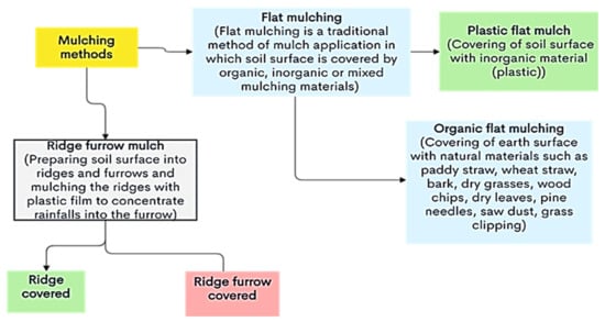 Mulching is a common practice that involves applying materials to the field before, during, or soon after sowing in order to support and spread over the soil surface, such as plastic material, crop residues, livestock manure, sands, rocks, and cement []. The main goals of mulching are to limit evaporation or water erosion [], boost soil temperature, improve the soil water supply capacity [,], and suppress weeds []. Mulching causes improvement in crop production, fosters plant growth, and reduces water usage [,] as shown in Figure 3.