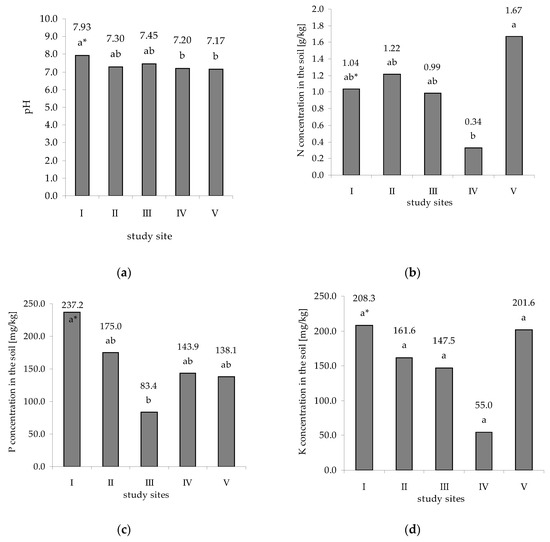 The pH value of soil (a) and the levels of soil mineral nutrient at the depth 0–20 cm in particular study sites (see Table 1): N (b), P (c), and K (d). * For each location, the mean values of the tested feature for each year followed by the same letter are not statistically different, and others are (Tukey HSD test, α ≤ 0.05). Letters indicate the differences between the study sites within a given examined feature.