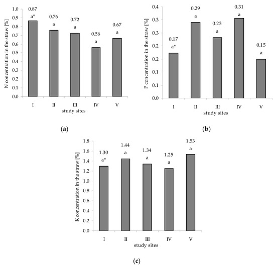 Chemical compositions in the straw of A. spica-venti (% dry matter) in particular study sites (see Table 1): (a) N concentration in the straw, (b) P concentration in the straw, and (c) K concentration in the straw. * For each location, the mean values of the tested feature for each year followed by the same letter are not statistically different, and others are (Tukey HSD test, α ≤ 0.05). Letters indicate the differences between the study sites within a given examined feature.