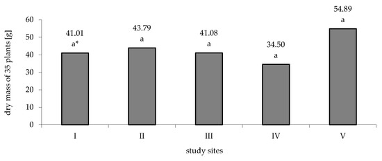 The dry mass of plants depending on the study sites (see Table 1): * For each study site, the values of mass followed by the same letter are not statistically different, and others are (Tukey HSD test, α ≤ 0.05). Letters indicate the differences between study sites within a given examined feature.