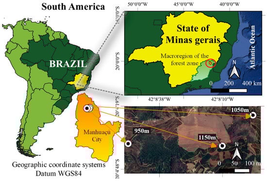 The work was carried out in the city of Manhuaçu, located in the region of Matas de Minas, state of Minas Gerais, Brazil (Figure 1). Coffee fruits (Coffea arabica L.) of the cultivar Catuaí IAC 144 were harvested in three productive areas located at different altitudes: 950, 1050 and 1150 m above mean sea level (mamsl).