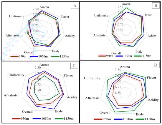 Average dispersion of aroma, flavor, acidity, body, overall, aftertaste and uniformity of coffees from three altitudes (950mamsl, 1050mamsl and 1150mamsl) on the face of the plant exposed to morning sun (A,C) and afternoon sun (B,D) in post-harvest wet (A,B) and dry (C,D) processing.