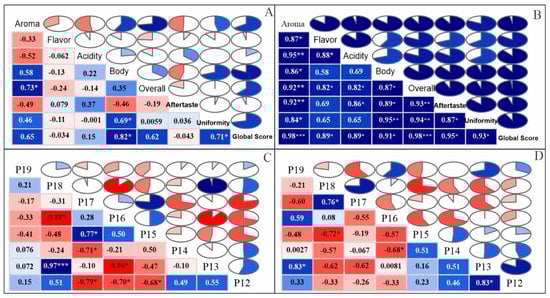 Estimates of the Pearson correlation coefficients of the variables that constitute the sensory characteristics group (fragance/aroma, uniformity, flavor, body, overall, aftertaste, balance and global score) and grain size (18 sieve (P18); 17 sieve (P17); 16 sieve (P16); 15 sieve (P15); 14 sieve (P14); 13 sieve (P13); 12 sieve (P12)), respectively for post-processing of wet harvest (A,C) and dry harvest (B,D). On the lower diagonal are represented the correlation and significance estimates by the t test, significant at 5% (*), 1% (**) and 0.1% (***).