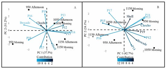 It was also possible to observe that for the hulled cherry coffee (Figure 6A), the altitudes of 1050mamsl and 1150mamsl on both sides of exposure of the plants to the sun were well grouped, with 1050mamsl being well associated with the sieves 12 (p12) and 13 (p13) and 1150mamsl showed good association with sieves 14 (p14), 15 (p15) and bark. On the other hand, the coffees from treatments at 950mamsl in the morning sun were well associated with the 18 sieve (p18) and were placed far away at 950mamsl in the afternoon sun, which correlated well with the 16 sieve (p16) and chocho grain.