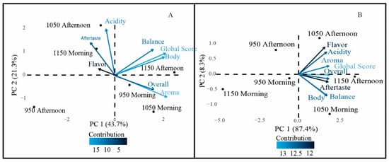 Graphic dispersion of six treatments at three different altitudes (950, 1050 and 1150mamsl) and two faces of plant exposure to solar radiation (morning sun and afternoon sun), in relation to the first main components based on sensory characteristics in the two types of post-harvest processing: wet (A) and dry (B).