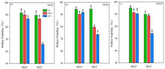 The pollen viability of three inbred late varieties under different temperature treatments. (a) XWX2. (b) XWX8. (c) XWX17. DAT: Days after temperature treatments; XWX2: Xiangwanxian2; XWX8: Xiangwanxian8; XWX17: Xiangwanxian17; NT: Normal temperature control; MCS: Moderate chilling stress; ECS: Extreme chilling stress. Different lowercase letters denote statistical differences among treatments of a cultivar at the 5% level according to LSD test. Error bars above mean indicate standard error (n = 3).