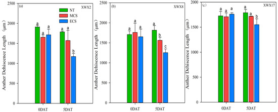 The anther dehiscence length of three inbred late varieties under different temperature treatments. (a) XWX2. (b) XWX8. (c) XWX17. DAT: Days after temperature treatments; XWX2: Xiangwanxian2; XWX8: Xiangwanxian8; XWX17: Xiangwanxian17; NT: Normal temperature control; MCS: Moderate chilling stress; ECS: Extreme chilling stress. Different lowercase letters denote statistical differences among treatments of a cultivar at the 5% level according to LSD test. Error bars above mean indicate standard error (n = 3).