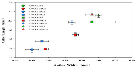 The anther length and anther width of three inbred late varieties under different temperature treatments. XWX2: Xiangwanxian2; XWX8: Xiangwanxian8; XWX17: Xiangwanxian17; NT: Normal temperature control; MCS: Moderate chilling stress; ECS: Extreme chilling stress.